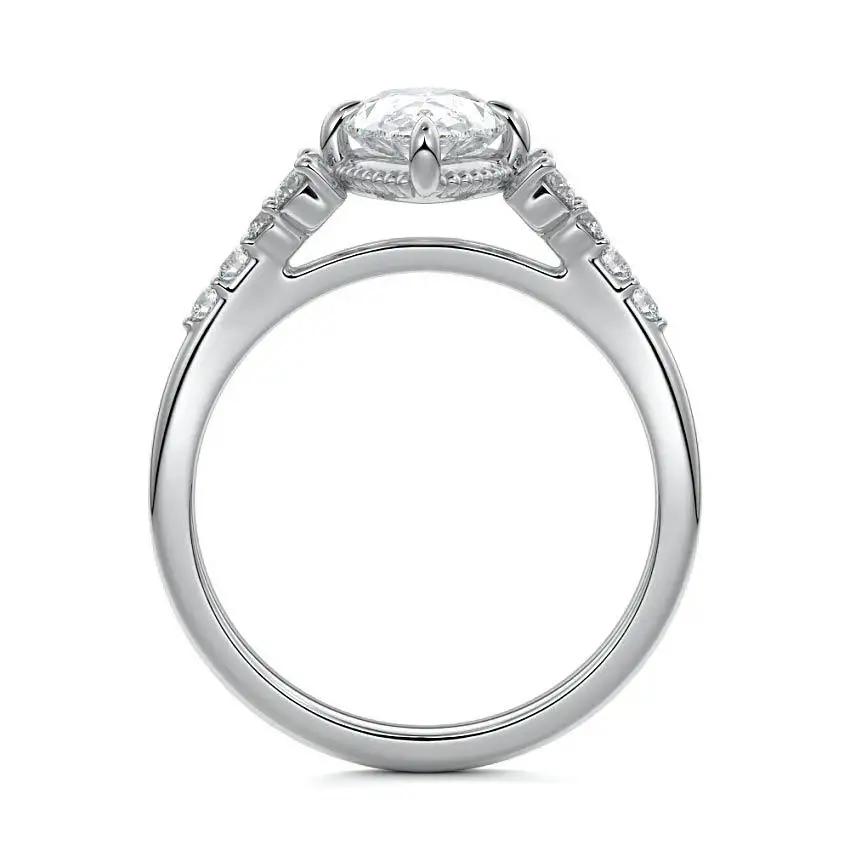 Start with a Setting: Choose halo, pavé, three‑stone, hidden halo, or classic solitaire, then match it to any stone and metal.